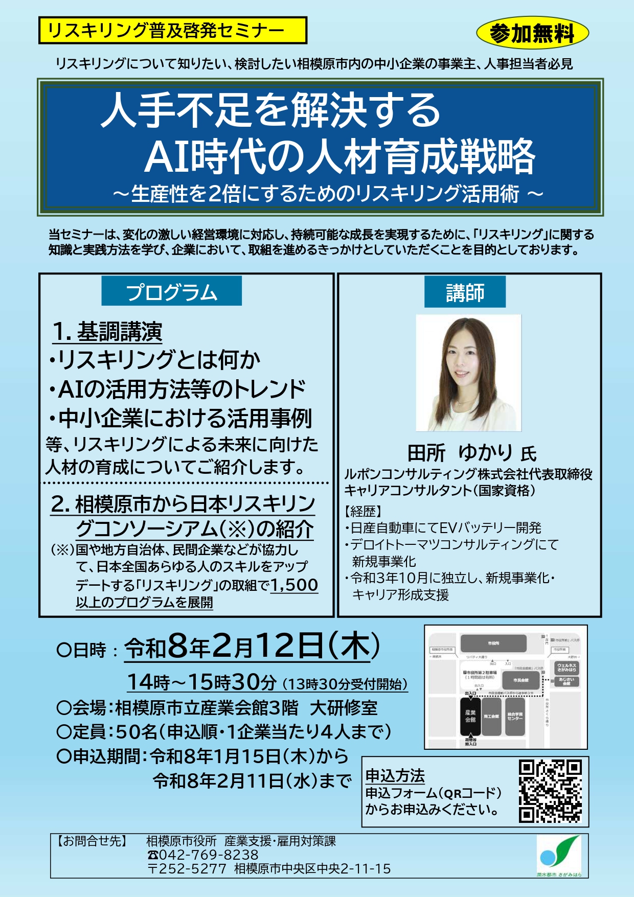 | 内容 | 1. 基調講演 【講師:田所 ゆかり氏(ルポンコンサルティング株式会社代表取締役、 キャリアコンサルタント(国家資格)】 ・リスキリングとは何か ・AIの活用方法等のトレンド ・中小企業における活用事例 等 2. 日本リスキリングコンソーシアムの紹介 |