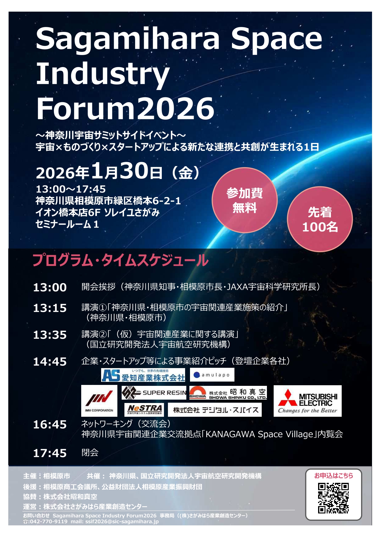 この度、同協定に係る取組として、相模原市内をはじめとする宇宙関連産業プレイヤーが一堂に会し、宇宙関連産業に関する講演のほか、来場者及び登壇者を交えたネットワーキングイベント「Sagamihara Space Industry Forum 2026」を、神奈川県及びJAXAと共催にて開催します。