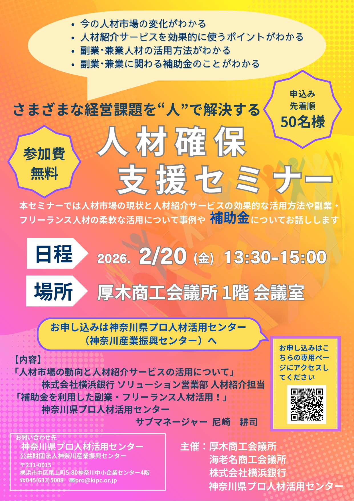 | 主催 | 厚木商工会議所、海老名商工会議所、株式会社横浜銀行、 神奈川県プロ人材活用センター(公益財団法人神奈川産業振興センター) |